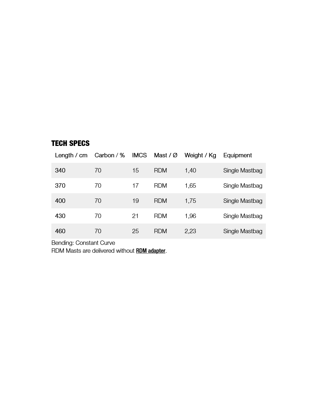 The high-performance carbon masts with low weight and high dynamics, for all demanding windsurfers. 70-75% carbon provide a very good response and help every sail to twist fast and deliver top performance. Ideal for wave, freemove, freeride and freerace sails.