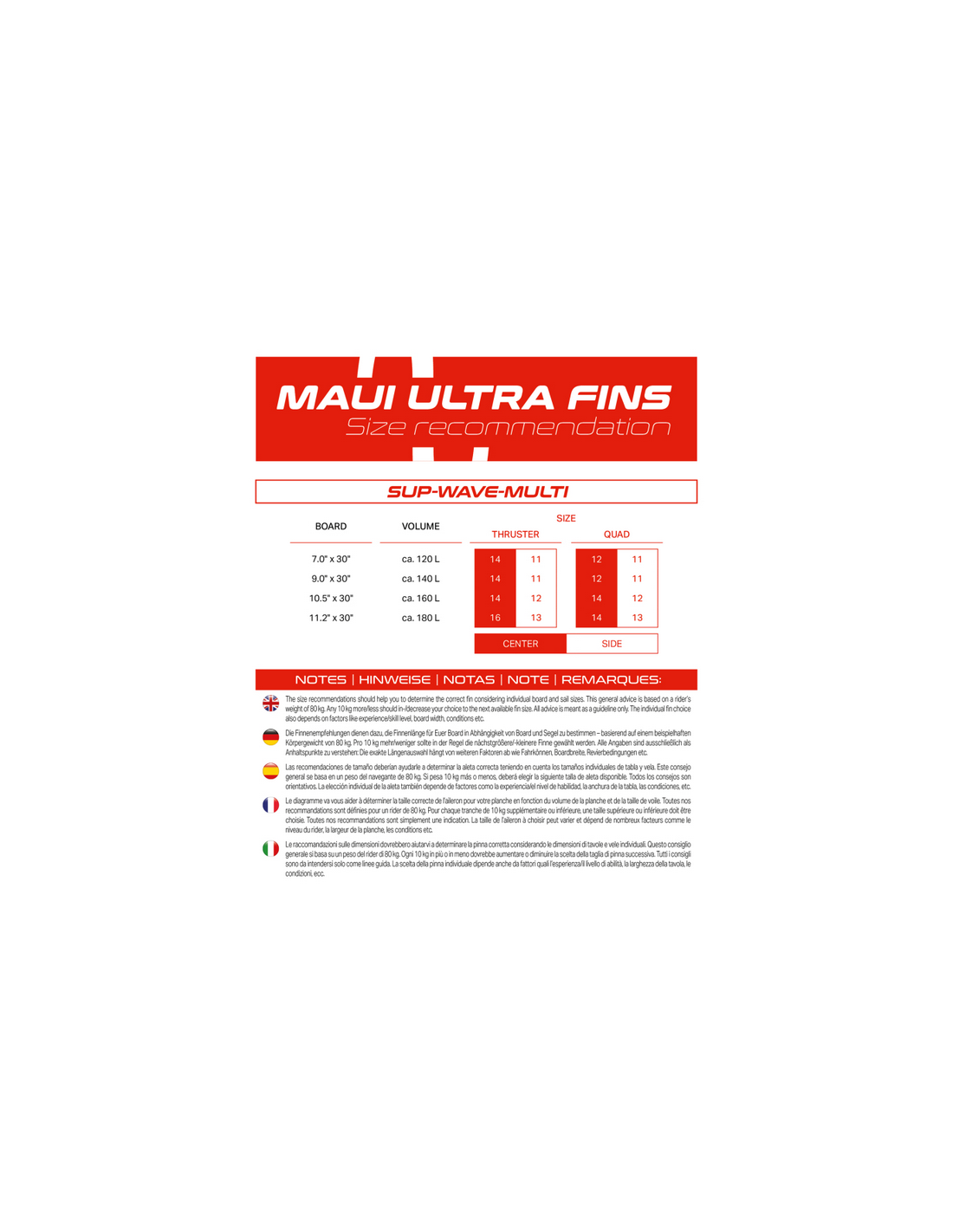 SUP-Wave-Multi fins are the result of an intensive cooperation with Lars Petersen, Danish windsurf- and SUP-expert. They are available as thruster and quad-setups (see below) that feature robust G-10 center fins for fast rides combined with flexible half-profiled honeycomb side fins for super slashy and carving turns.